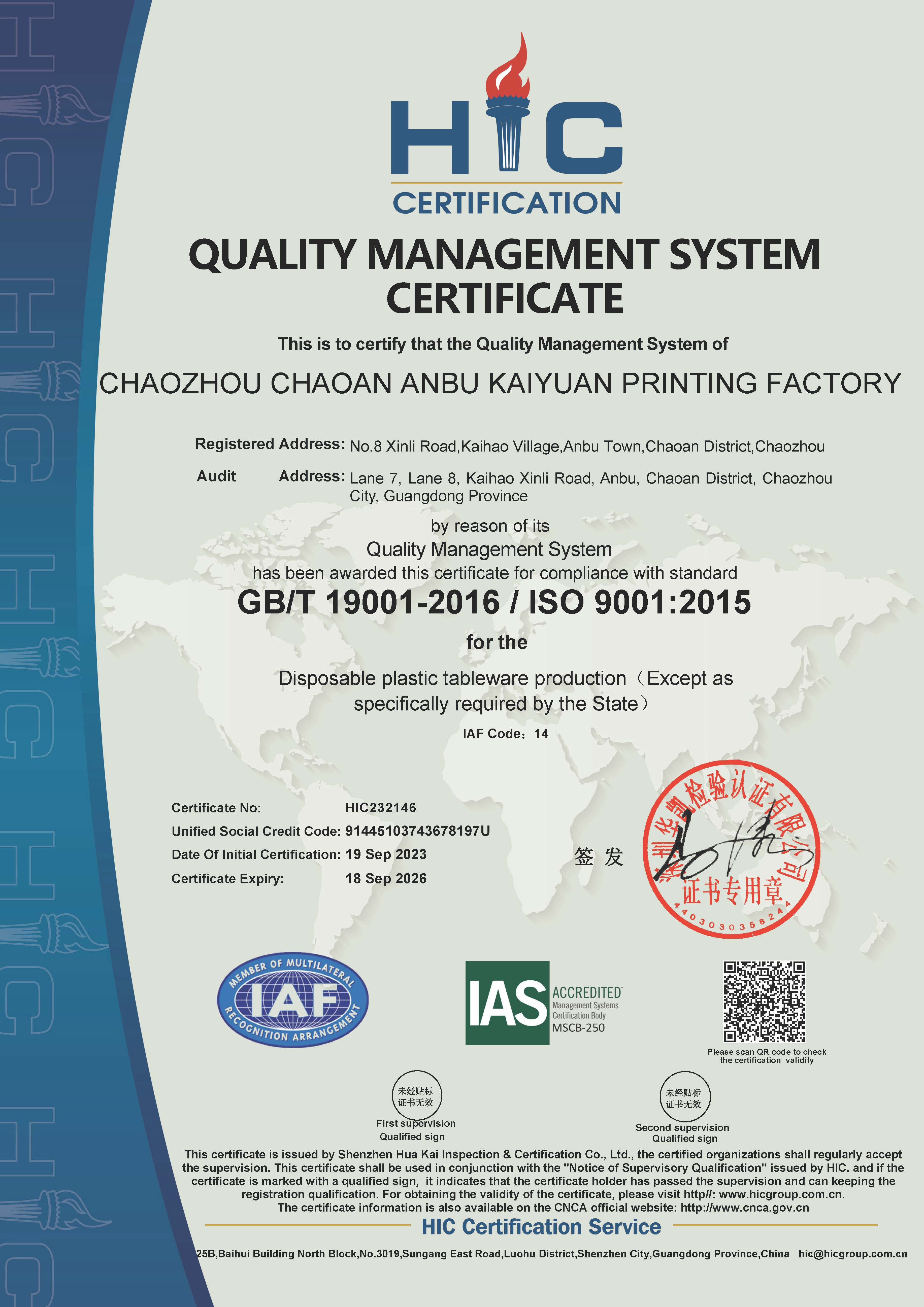 Chaozhou chaoan anbu kaiyuan printing factory is local in the beautiful city of sourth China - Chaozhou city, Guangdong province. We are a high-technology manufacturer of plastic products, professionally manufacturing environmentaly friendly PP, PS, PET materials packaging products, Stand-up pouches, octagonal sealing bags, spout pouches, food-grade roll films and other flexible packaging.